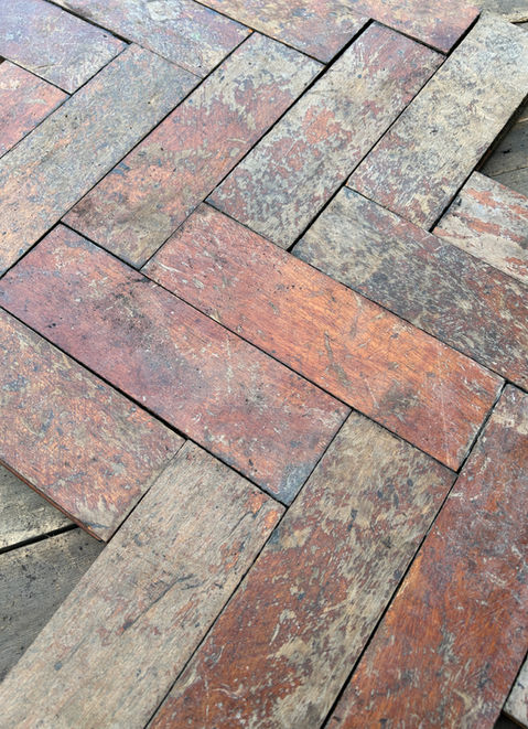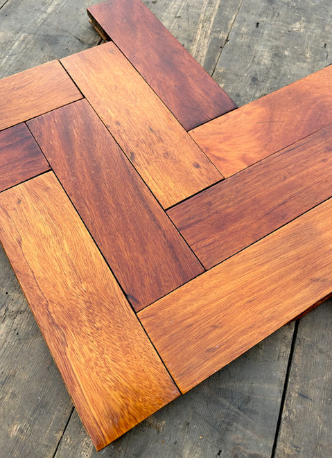 Opepe parquet flooring salvaged from Woodmill High School in Dunfermline, Fife. Opepe is a hardwood originating from Western & Central Africa. It is very durable with a varied, reddish-brown colour tone. Opepe is suitable for both domestic and commercial use. The images show the blocks in their salvaged condition and after sanding with a hard-wax oil finish.